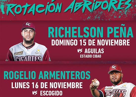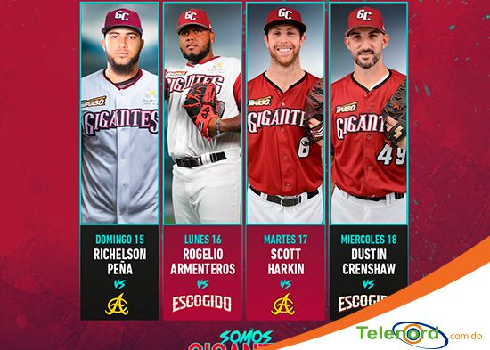San Francisco de Macorís. –Los Gigantes del Cibao anunciaron su rotación de pitcheo para los próximos cuatro juegos de la temporada, iniciando esta noche con el derecho Richelson Peña vs Tigres del Licey.