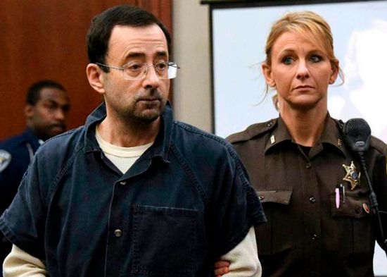 Larry Nassar, izquierda, es conducido por una agente de seguridad durante el juicio donde fue condenado a pasar el resto de su vida tras las rejas.