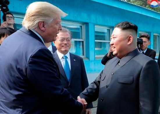 Kim y Trump se dieron un apretó de manos a través de la Línea de Demarcación, e instantes más tarde el mandatario estadounidense cruzó los pequeños bloques e ingresó formalmente al territorio de Corea del Norte.