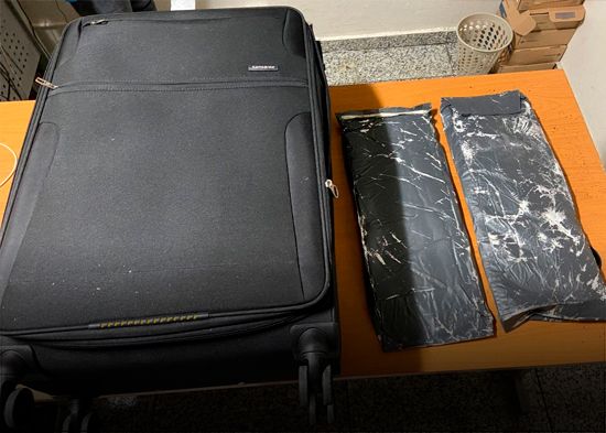 Tras iniciar un proceso de inspección más riguroso y en presencia de un fiscal adjunto, se descubrió un doble fondo en el interior de la maleta, donde se ocuparon dos láminas presumiblemente cocaína, con un peso aproximado de 1.8 kilogramos.