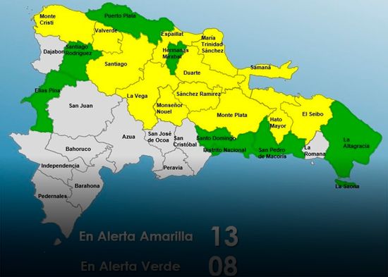 Santo Domingo.- El Centro de Operaciones de Emergencia (COE) mantiene 13 provincias en alerta amarilla y 8 en verde, debido a que la vaguada ha continuado provocando un ambiente húmedo e inestable sobre gran parte del país, generando las ocurrencias de lluvias de diferentes intensidades y frecuencias.