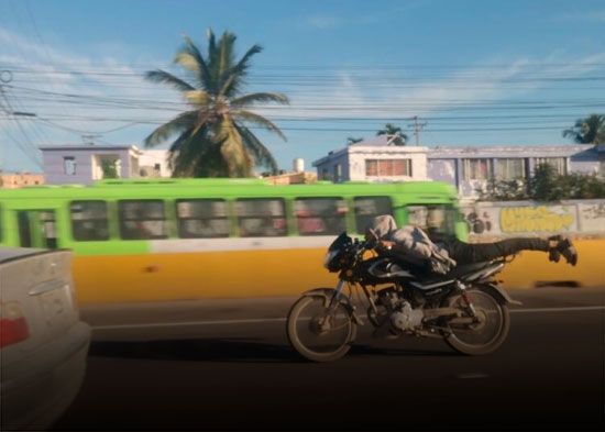 En la Autopista Las Américas, un joven con menos de 30 años, conduce una motocicleta, pero de una forma inusual, acostado encima de ella (planchado, en término dominicano), y con una velocidad extrema. Viste de ropa ligera, no usa casco protector y lleva un abrigo de capucha.