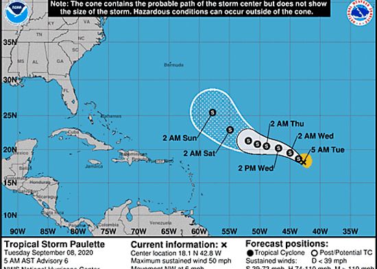 La Oficina Nacional Meteorología informó que vigila la Tormenta Tropical Paulette, la cual, se localiza a unos 2,140 kilómetros al este de las islas del norte de las Antillas Menores, con vientos máximos sostenidos de 85 km/h, moviéndose hacia el oeste/noroeste a unos 9 km/h.