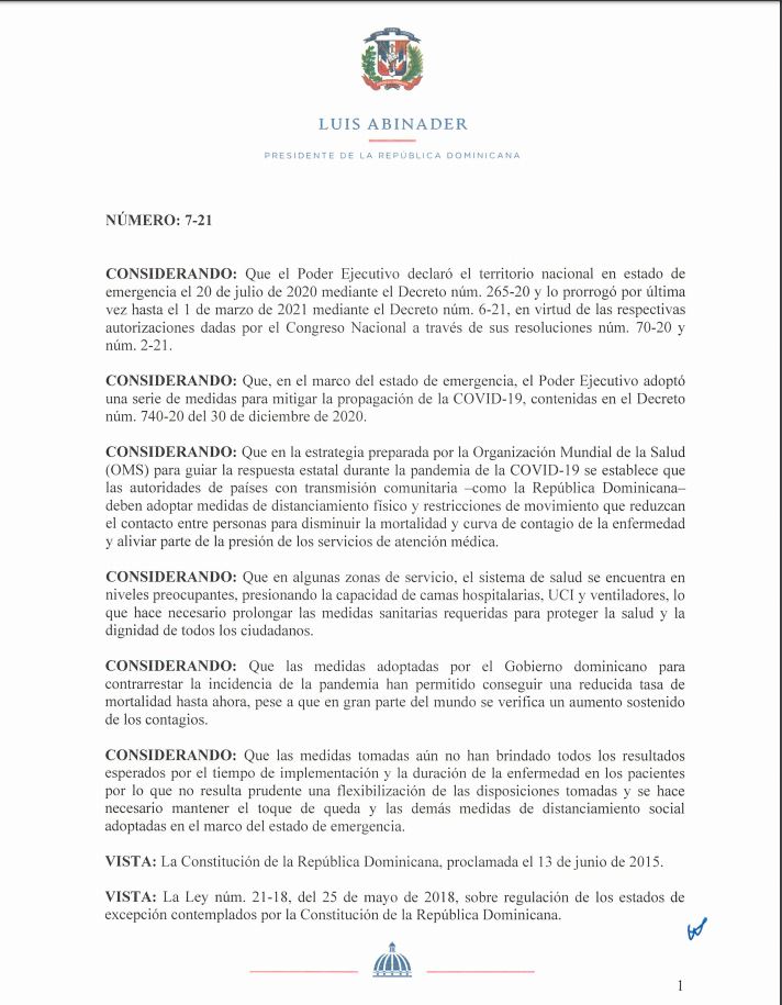 Con el decreto 7-21, el presidente de la República, Luis Abinader, informó la nueva fecha del toque de queda que regirá en el país y las nuevas normas con las cuales busca atenuar los contagios por COVID-19.