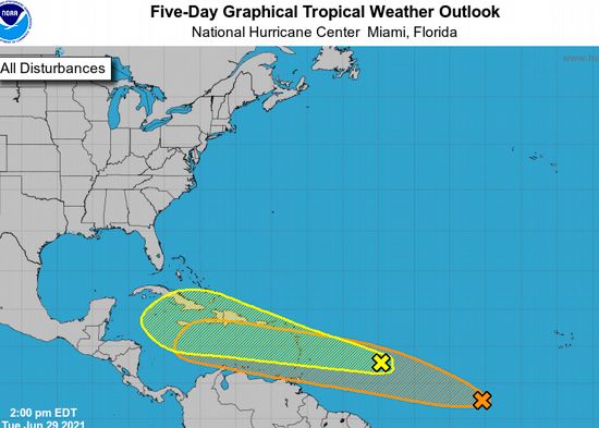 Este martes una de las ondas tropicales estaba situada a unas 850 millas (1.367 km) al este de las Antillas Menores y es posible, según el NHC, "algún desarrollo lento" a finales de esta semana y este próximo fin de semana mientras el sistema se mueve hacia el oeste a oestenoroeste a una velocidad de 15 a 20 millas por hora (24 a 32 km/h).