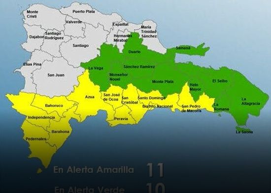 Las provincias en alerta amarilla son: Barahona, San José de Ocoa, Santo Domingo, Pedernales, San Cristóbal, Distrito Nacional, La Romana, Independencia, Peravia, Azua y San Pedro de Macorís.