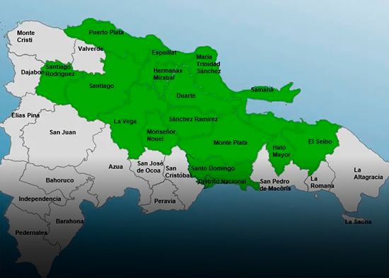 Las provincias bajo alerta son: Monseñor Nouel, Hermanas Mirabal, Puerto Plata, Distrito Nacional, Santiago Rodríguez, Espaillat, María Trinidad Sánchez, Duarte, Provincia Santo Domingo, Hato Mayor, La Vega, Sánchez Ramírez, Monte Plata, El Seibo y Santiago.