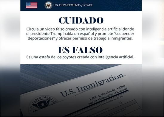 «Circula un video falso creado con inteligencia artificial donde el presidente Trump habla en español y promete suspender deportaciones y ofrecer permisos de trabajo a inmigrantes. Es falso; se trata de una estafa de coyotes creada con inteligencia artificial», advirtió la embajada a través de su cuenta en la red social X.