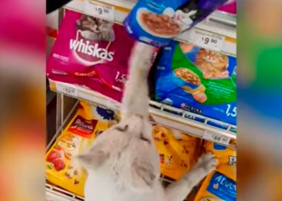 Sin embargo esto solo forma parte de una estrategia del gato, pues lo que hace a continuación, es dirigirse hasta el estante de comida para mascotas, donde empieza a hacer ruidos para llamar la atención y seleccionar su comida favorita para que la persona se la compre.