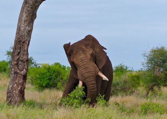 Pese a que su cuidador intenta apartar al animal en repetidas ocasiones, el elefante no ceja en su empeño y el tejado de la estructura quedó seriamente afectado. Finalmente, el animal retrocede y abandona el lugar.