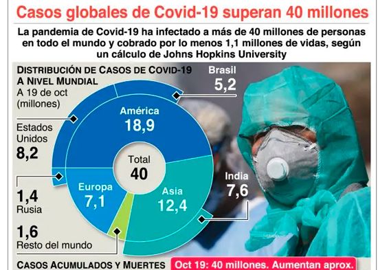 Los casos globales de Covid-19 superaron ayer la barrera de los 40 millones, después de que se registraran casi 300,000 nuevos positivos en las últimas 24 horas, según las cifras de la Organización Mundial de la Salud.