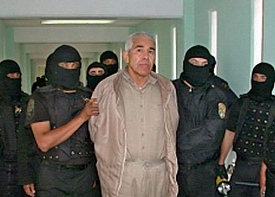 Caro Quintero liberado por las autoridades mexicanas en 2013 cuando cumplía una pena de 40 años por el homicidio en 1985 del agente de la DEA Enrique Camarena; debido a una polémica resolución que posteriormente revertida y considerada un error por la Suprema Corte de Justicia de México.