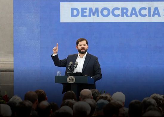 La democracia, dijo Boric, "no puede darse por sentada, se construye día a día, se perfecciona y se profundiza, porque cuando la democracia no es capaz de dar respuesta a las grandes mayorías, se abre espacio para que algunos -que están generalmente en posiciones de privilegio- busquen echarla abajo con cualquier pretexto".