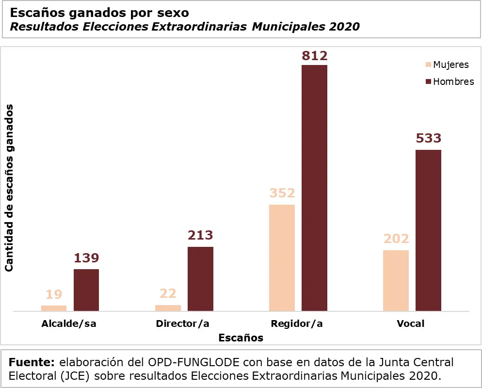 “A pesar de la aplicación de la cuota la cuota de género y juventud a partir de los comicios de 2020, las mujeres ocupan sólo el 25% de las plazas municipales ganadas y sólo el 18% de los escaños fueron ganados por personas menores de 34 años, destacando que esta participación se concentran principalmente en puestos secundarios, como regidores o vocales”, apunta el documento del OPD-FUNGLODE.