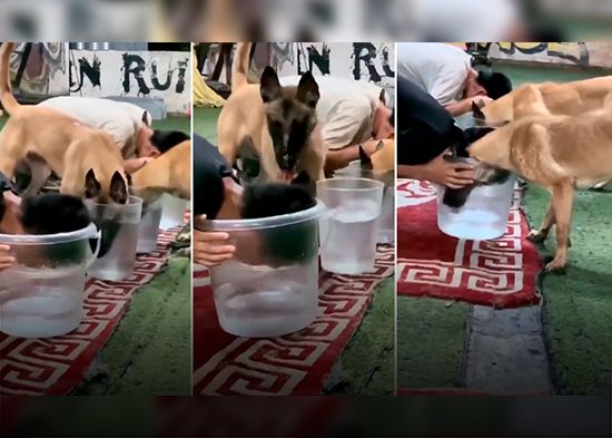 Un perro sorprendió y delató a su dueño haciendo trampa durante un desafío en el que competían para ver quién podía permanecer más tiempo con la cabeza bajo el agua sin respirar. En el video se observa al can observando a su dueño de manera sospechosa y, tras verificar y darse cuenta del truco en el balde de agua de su oponente, lo delata y comienza a ladrarle casi como si le estuviera reclamando. Finalmente, su dueño saca su cabeza del cubo y lo sorprende con un chorro de agua.